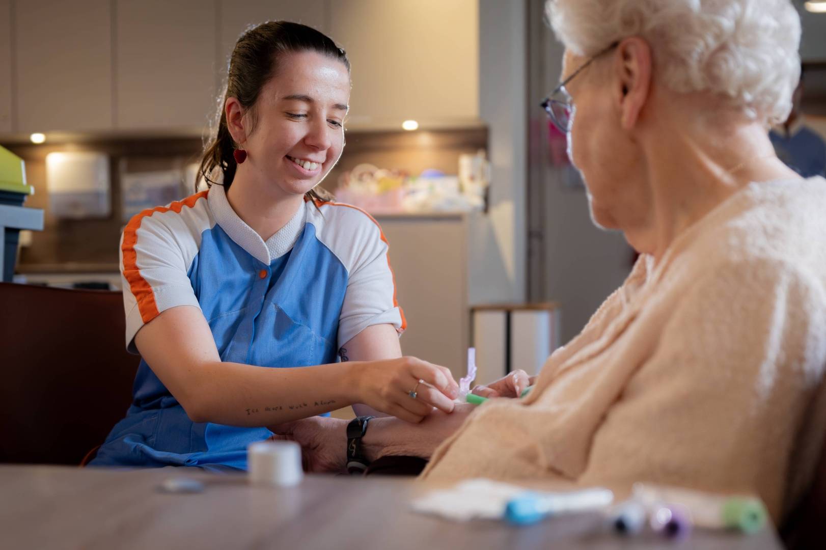 Vanaf haar eerste weken voelde Jade zich dan ook meteen welkom in het team. De sfeer ervaart ze als prettig en hartverwarmend, iets wat haar collega’s beamen. Volgens haar is dat een belangrijke reden waarom mensen hier graag blijven werken. Als het werk soms pittig is, kan ze bij haar collega’s terecht. “Je staat er nooit alleen voor. Collega’s helpen elkaar echt.” Zo moest Jade leren prioriteiten te stellen, omdat er veel op je afkomt en je niet alles in één werkdag kunt oplossen. Door veel te praten met collega’s en tips te vragen, leerde ze daar beter mee omgaan. Dat helpt, zeker omdat geen dag hetzelfde is in de ouderenzorg. Maar met een gepassioneerd team lukt het ook op drukke dagen om alles geregeld te krijgen.